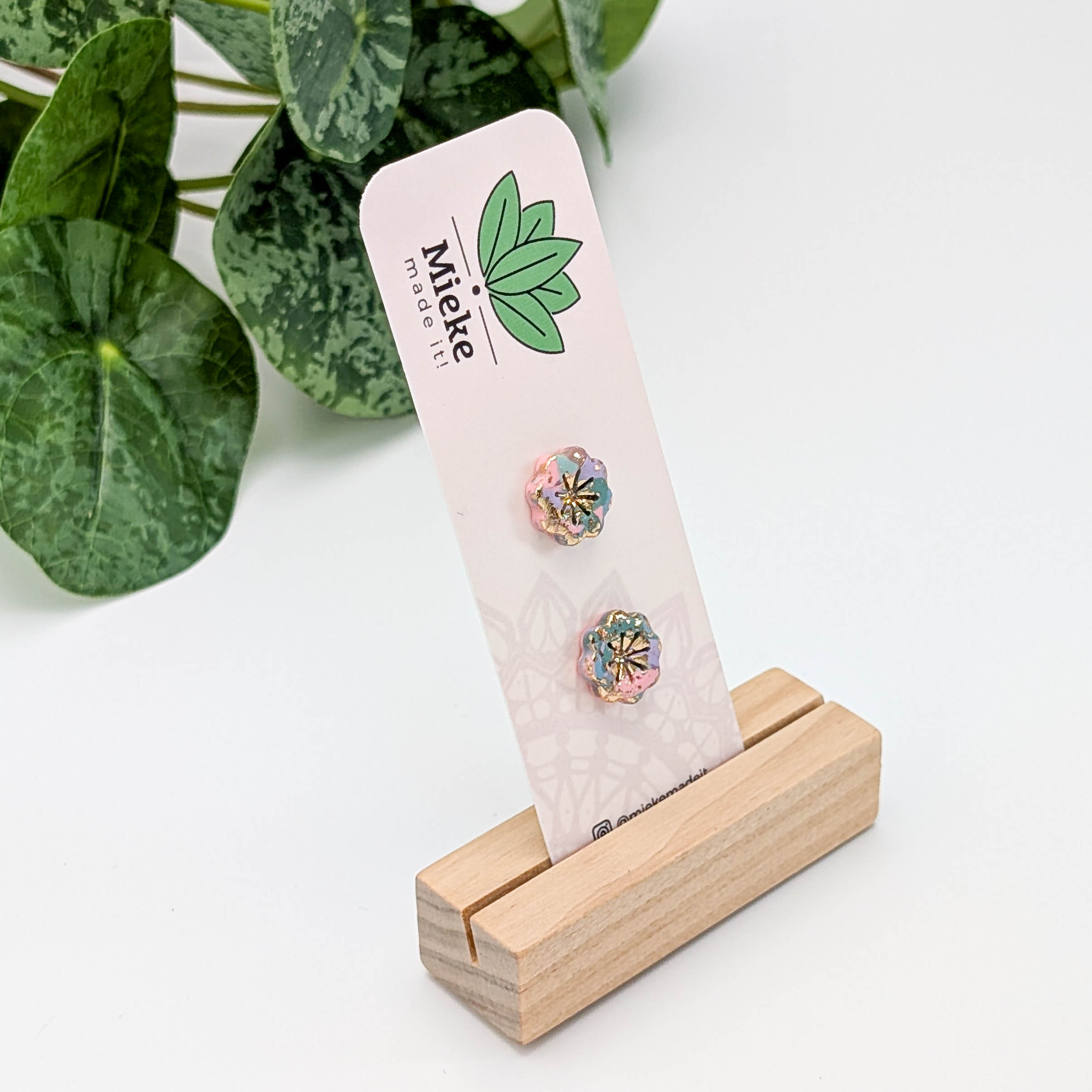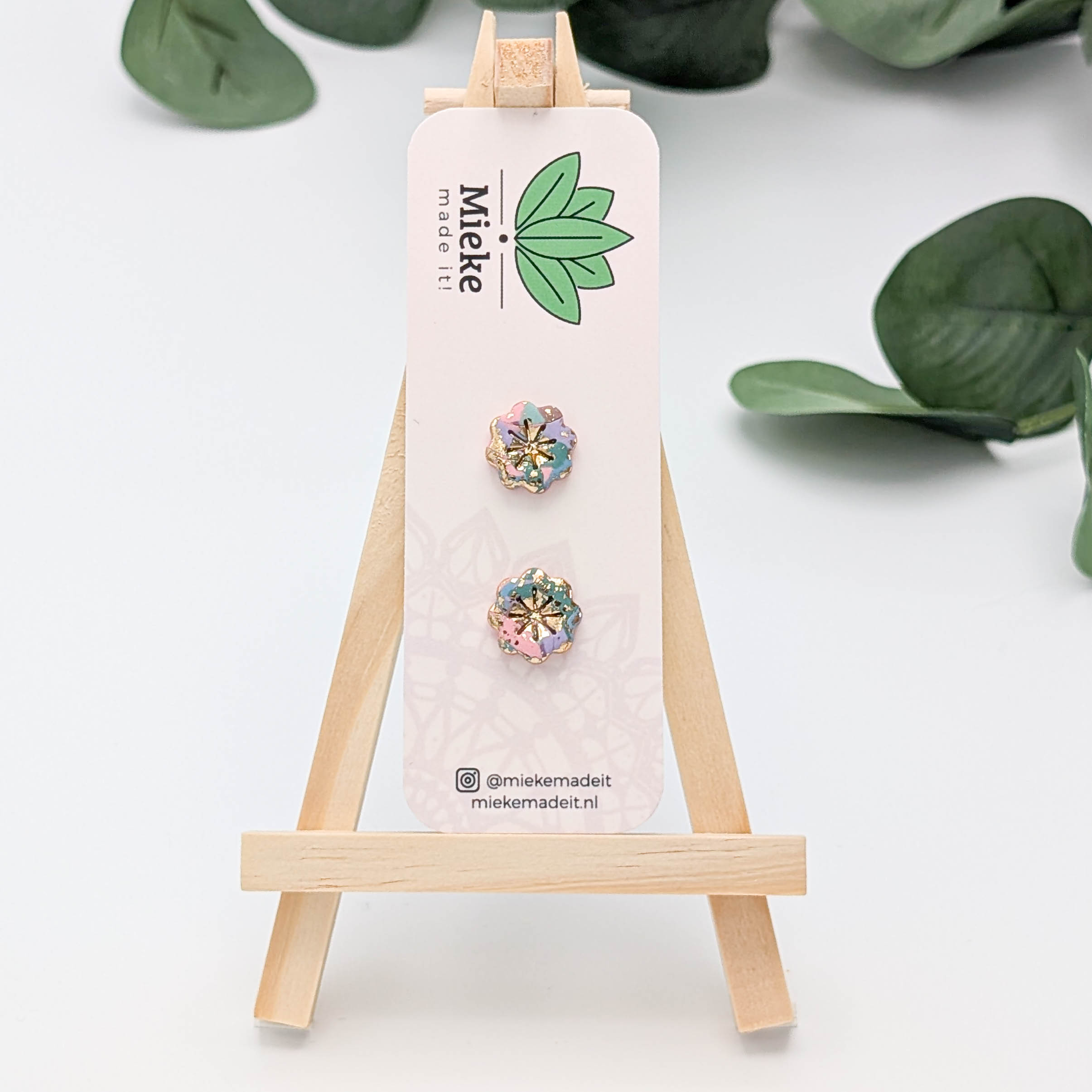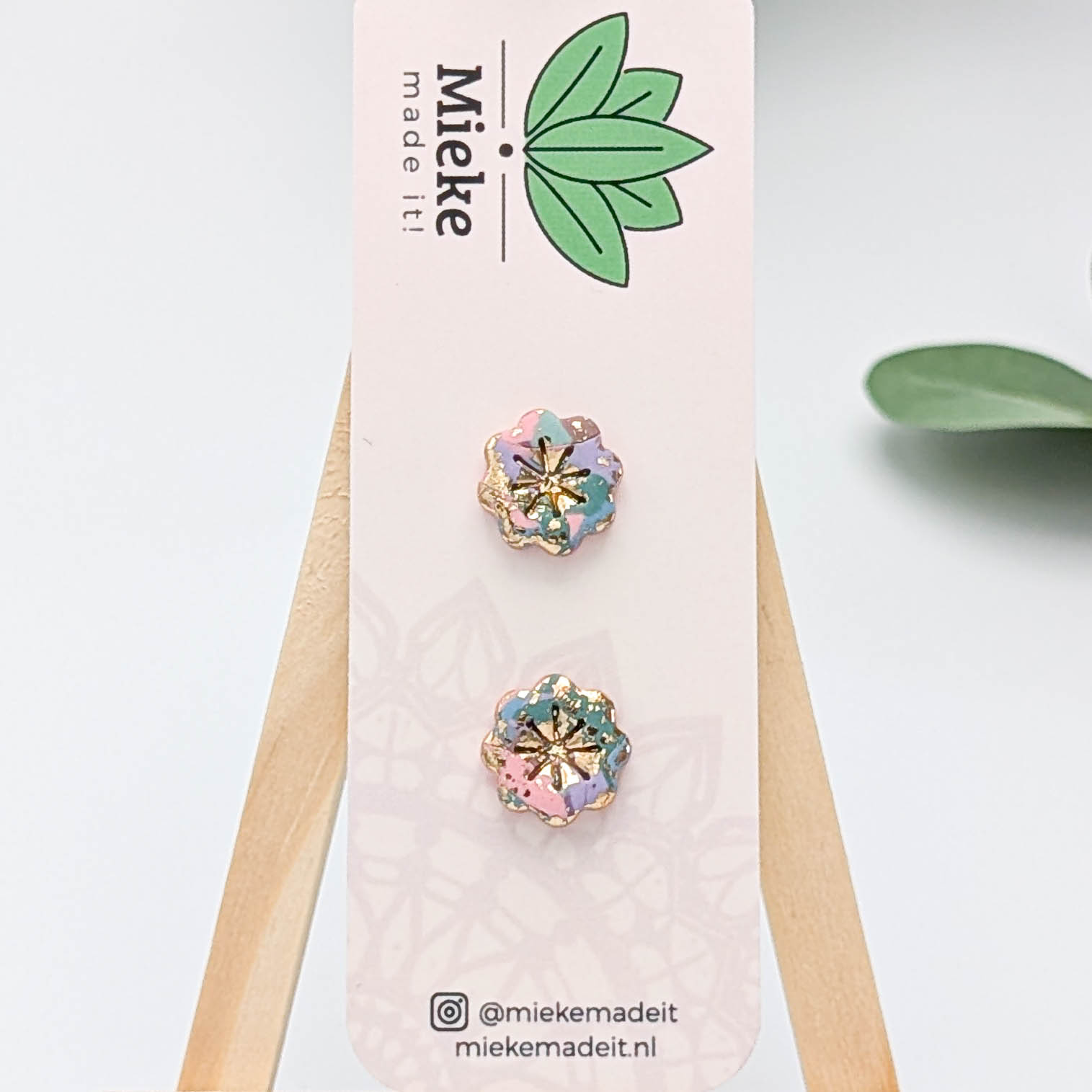 Deze oorstekers zijn gemaakt van polymeerklei. De stekers zitten ingebed in de achterkant van de klei en zijn gemaakt van roestvrij staal dat 18 karaats verguld is. De voorkant van de oorbellen heeft een doorsnede van 1,2 cm.