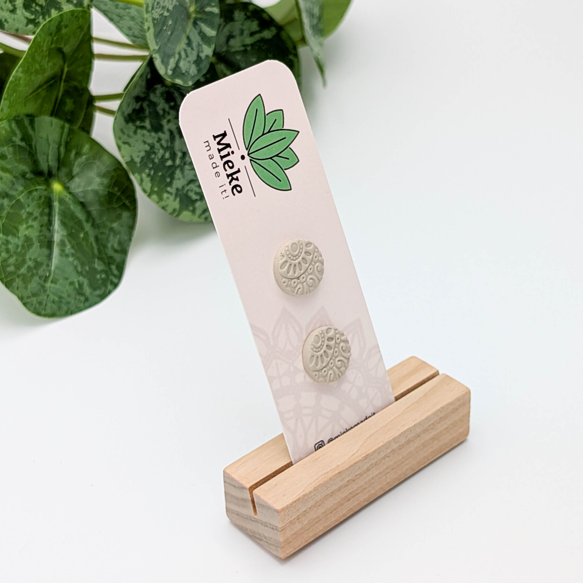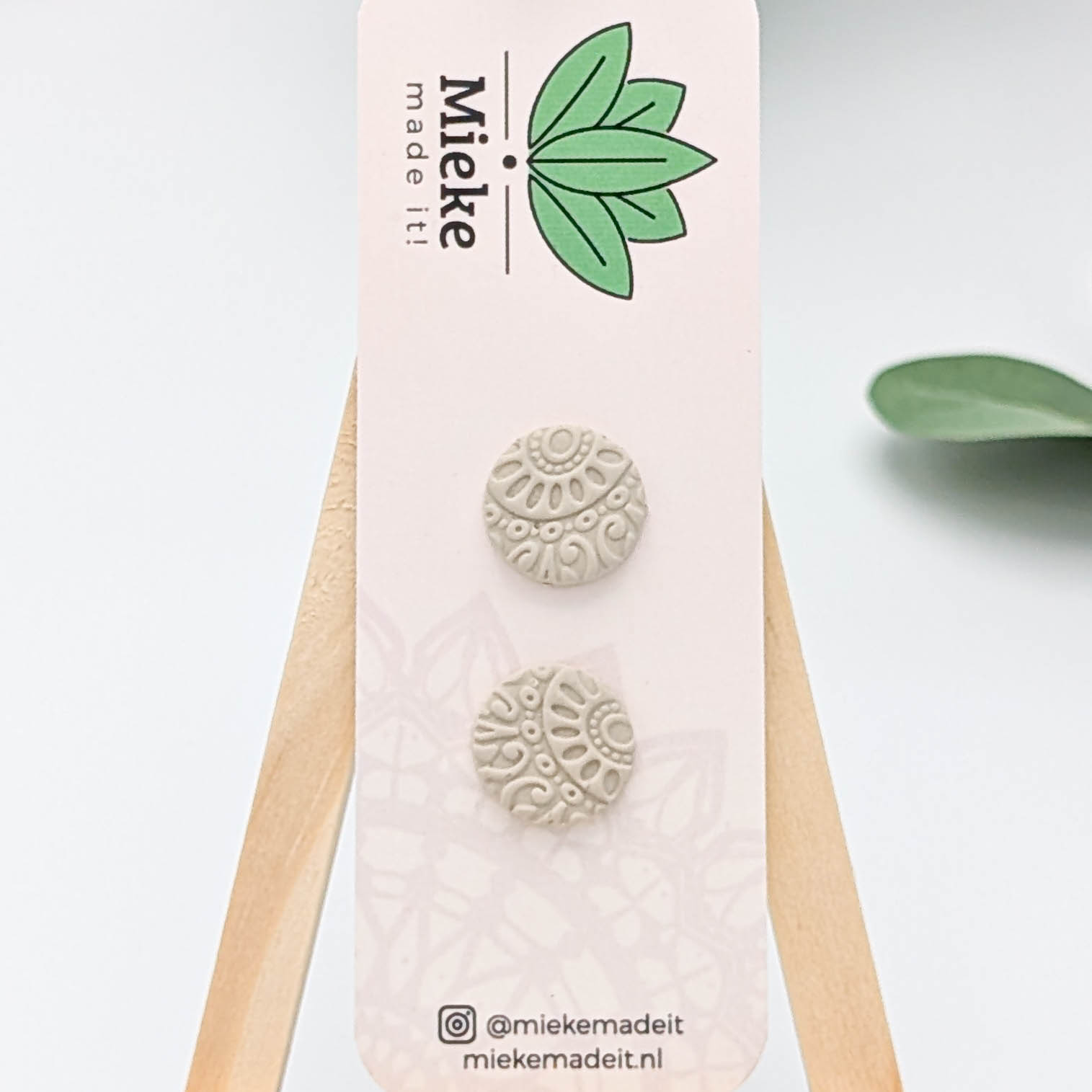 Deze oorstekers zijn gemaakt van polymeerklei. De stekers zitten ingebed in de achterkant van de klei en zijn gemaakt van roestvrij staal dat 18 karaats verguld is. De voorkant van de oorbellen heeft een doorsnede van 1,4 cm.
