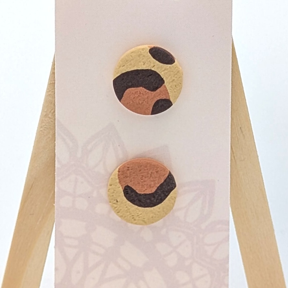 Deze oorstekers zijn gemaakt van polymeerklei. De stekers zitten ingebed in de achterkant van de klei en zijn gemaakt van roestvrij staal dat 18 karaats verguld is. De voorkant van de oorbellen heeft een doorsnede van 1,4 cm.