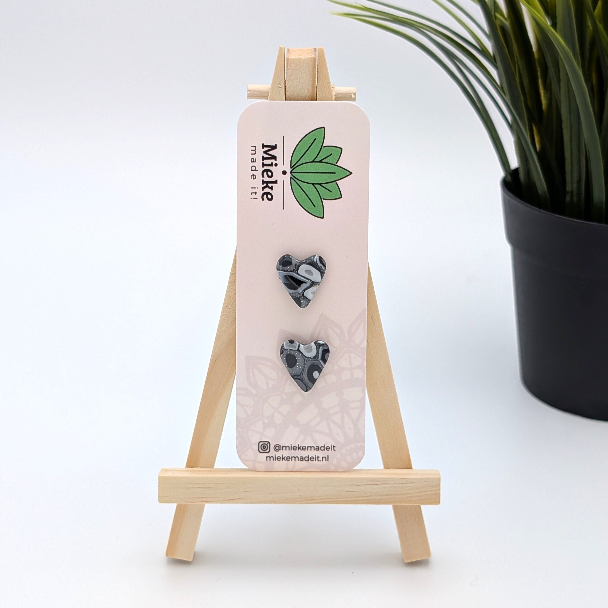 Deze oorstekers zijn gemaakt van polymeerklei. De stekers zitten ingebed in de achterkant van de klei en zijn gemaakt van roestvrij staal dat 18 karaats verguld is. De voorkant van de oorbellen heeft een doorsnede van 1,4 cm.